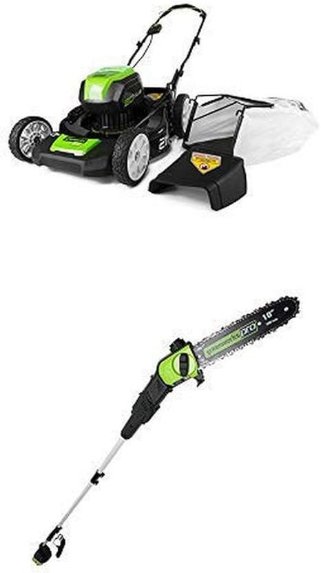 Details: Greenworks PRO 21-Inch 80V Cordless Lawn Mower with PRO 9′ 80V Cordless Pole Saw Battery Not Included PS80L00