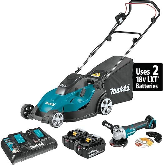 Details: Makita XML02PTX1 18V X2 (36V) LXT Lithium-Ion Cordless 17″ Lawn Mower Kit (5.0Ah) and Brushless Angle Grinder